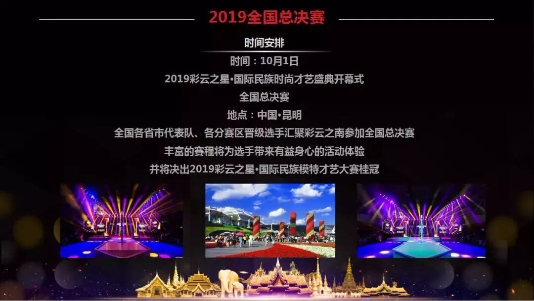 “2019彩雲之星•國際民族模特才藝大(dà)賽”是2019彩雲之星•國際民族時(shí)尚才藝盛典系列活動之一。全國總決賽暨盛典将于10月1日—7日在昆明(míng)舉辦。現(xiàn)場設大(dà)型綜藝舞台及民族、漢服、旗袍、動漫、國潮、親子六大(dà)主題發布秀場。一流的創編團隊+頂級舞美(měi)制作(zuò)規模将帶給選手更國際化、更高(gāo)大(dà)上(shàng)的舞台展示機會(huì)!