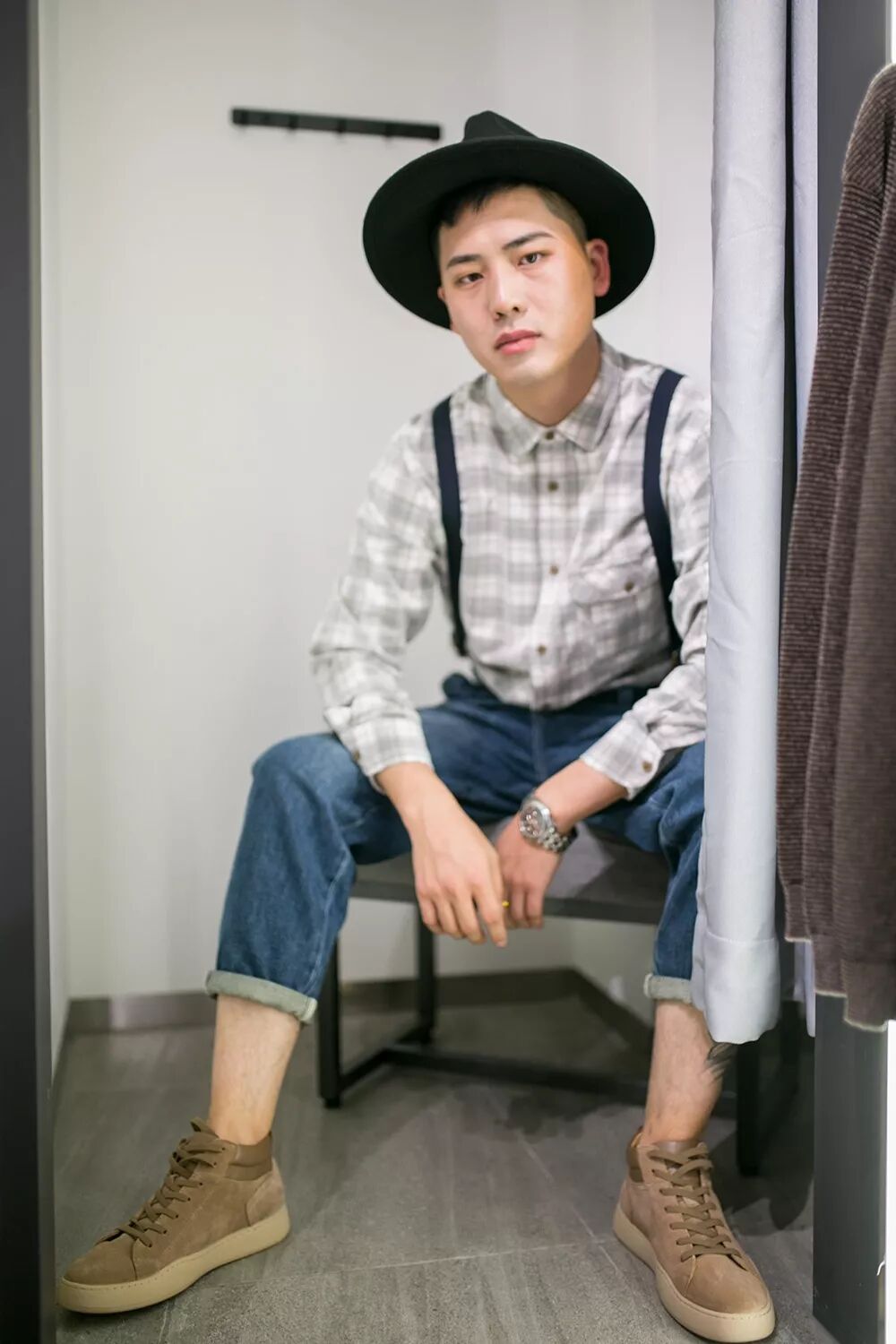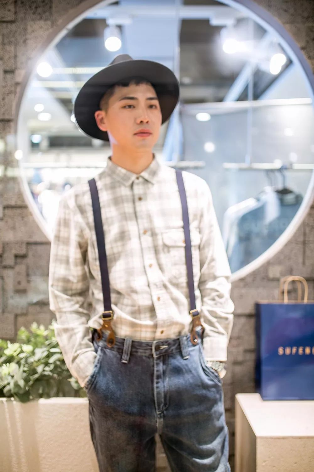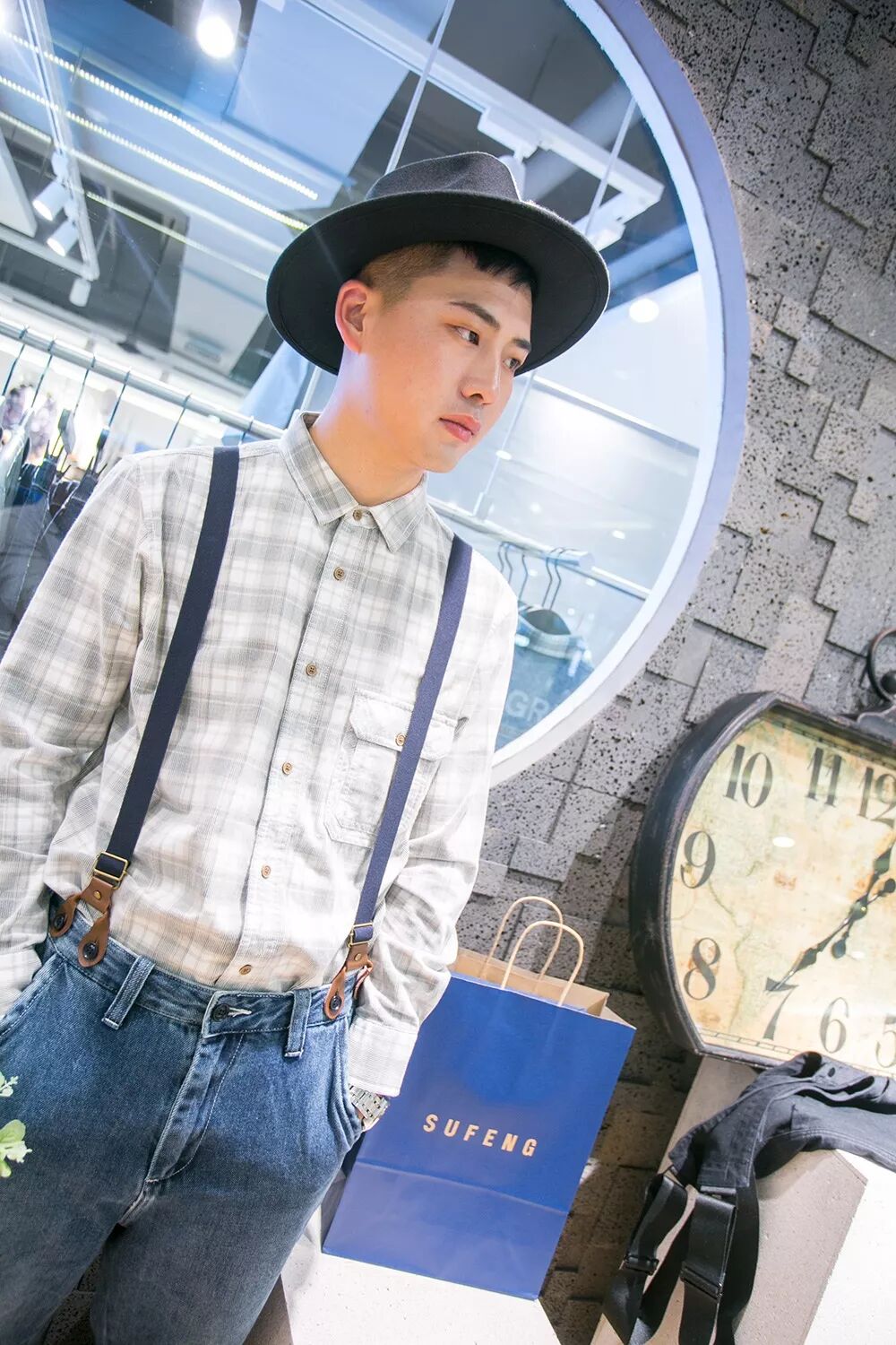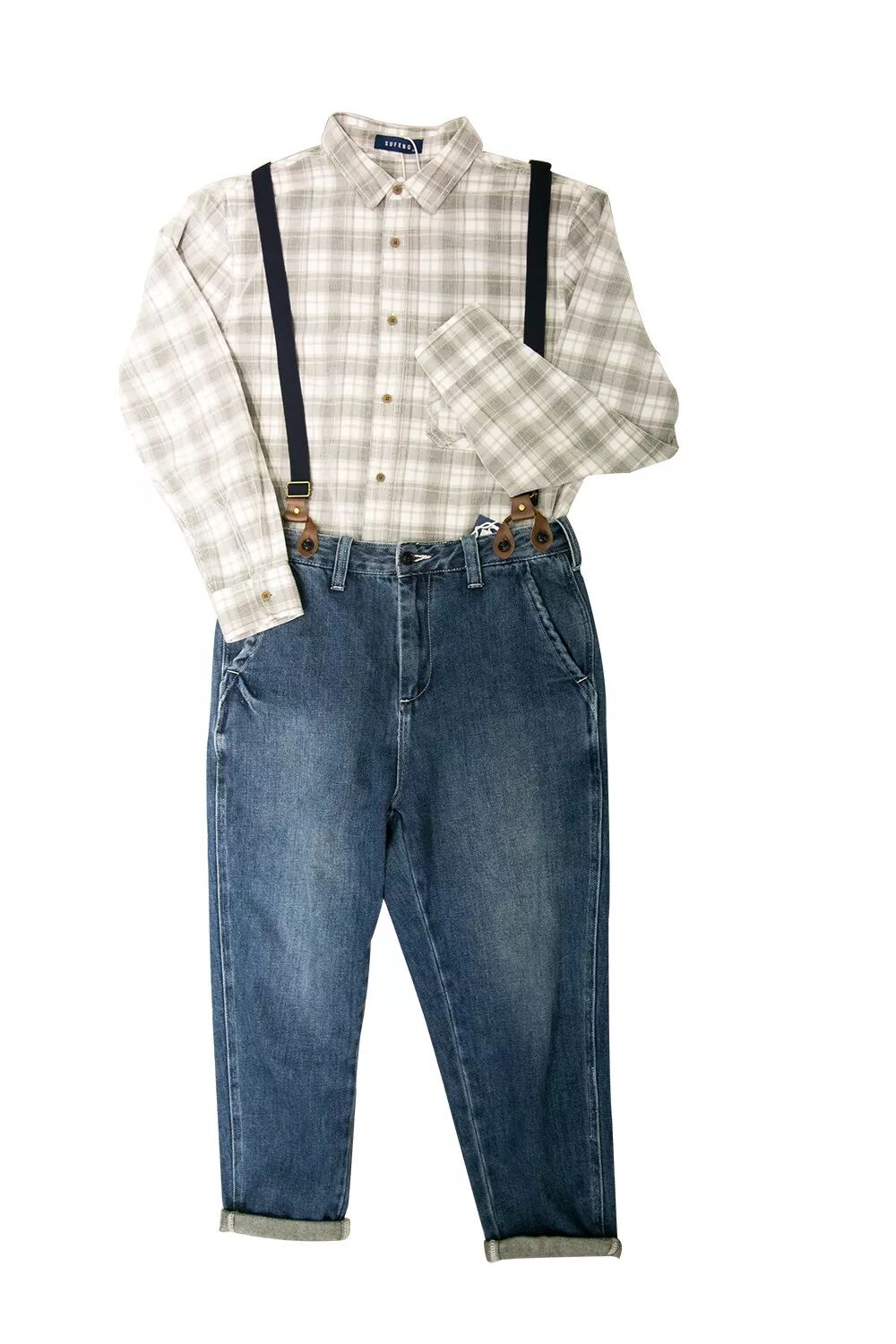 格子襯衫:248元 背帶牛仔褲:358元