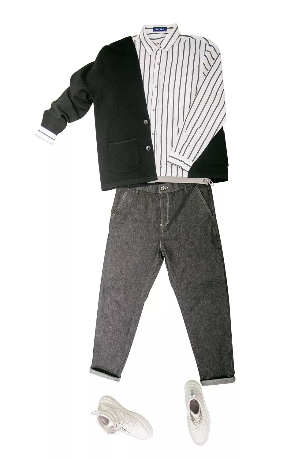 搭配了(le)豎條襯衫和(hé)黑色開(kāi)衫
